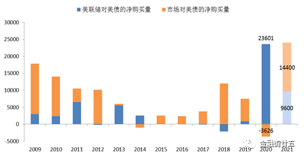 首先,美国国债净供给将大幅增加。美国总统拜登表示,将推行1.9万亿美元的刺激计划,随着民主党全面主导白宫和国会两院,拜登的刺激计划有望顺利推进,财政部将进一步扩大美债供给。同时,财政部的发行国债开始向中长期倾斜,导致债务的平均久期延长。综合多家机构预测,2021年美国国债净发行量将达到2.4-2.8万亿美元,剔除美联储购买的9600亿美元,市场投资者还将消化1.4-1.8万亿美元的美债供给,而去年市场净卖出了3600亿美元美国国债。2021年美联储的购买量急剧下降,美债供需结构面临巨大变化,将给美债收益率带来上行压力。
