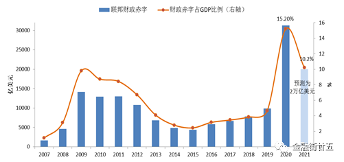 财政融资压力减轻是美联储缩减QE的前提条件。QE3期间美国财政赤字逐步收窄,2014年财政赤字占GDP的比重降至2.8%,已低于2008年的水平。相比之下,2020年赤字规模达到史无前例的3.1万亿美元,而市场预计2021年赤字仍将超过2万亿美元,占GDP的比重超过10%,公众持有的联邦政府债务占GDP规模将由去年的98%进一步升至104%。鉴于美国国债的供给压力较大,美联储须维持一定的QE规模来支持财政融资。