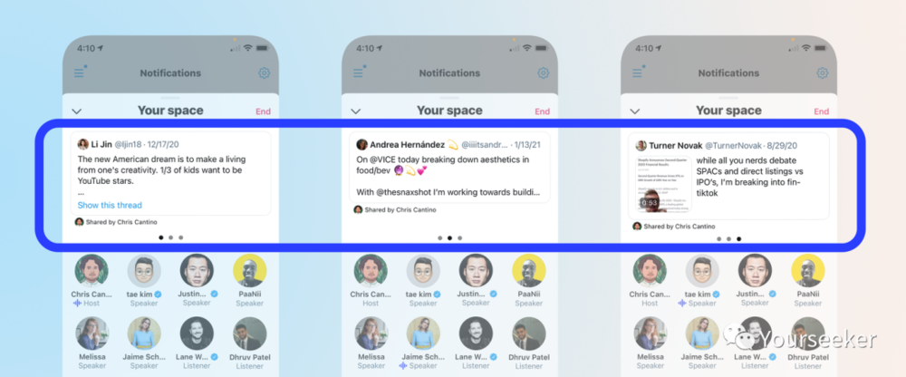 Twitter 一直十分看重用户时长的变化。如果大家单纯盯着 Spaces 的房间,那他们既不会浏览 Feed,也不可能看到广告。因此,Twitter 选择把 Spaces 最小化,用户可以同时滚动浏览时间线上的内容,同时把音频保留在后台。