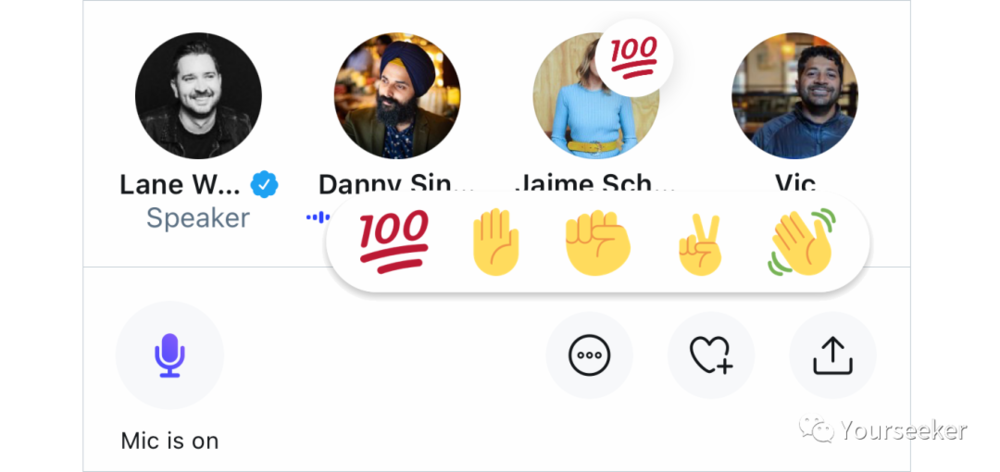 差异化之二在于 Spaces 拥有更多的表情符号反馈。只需单击一个按钮,听众和演讲者便可以扔出 ✊✌️或以表达自己的感受。它有助于衡量听众的情绪,而且比 Clubhouse 更直观。