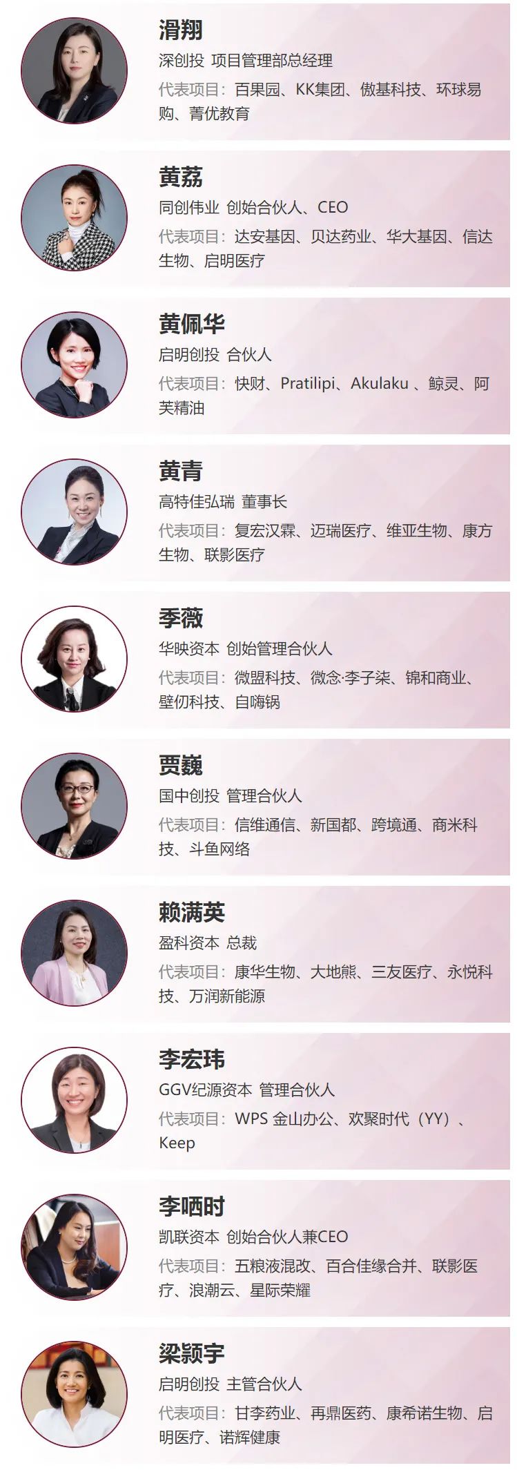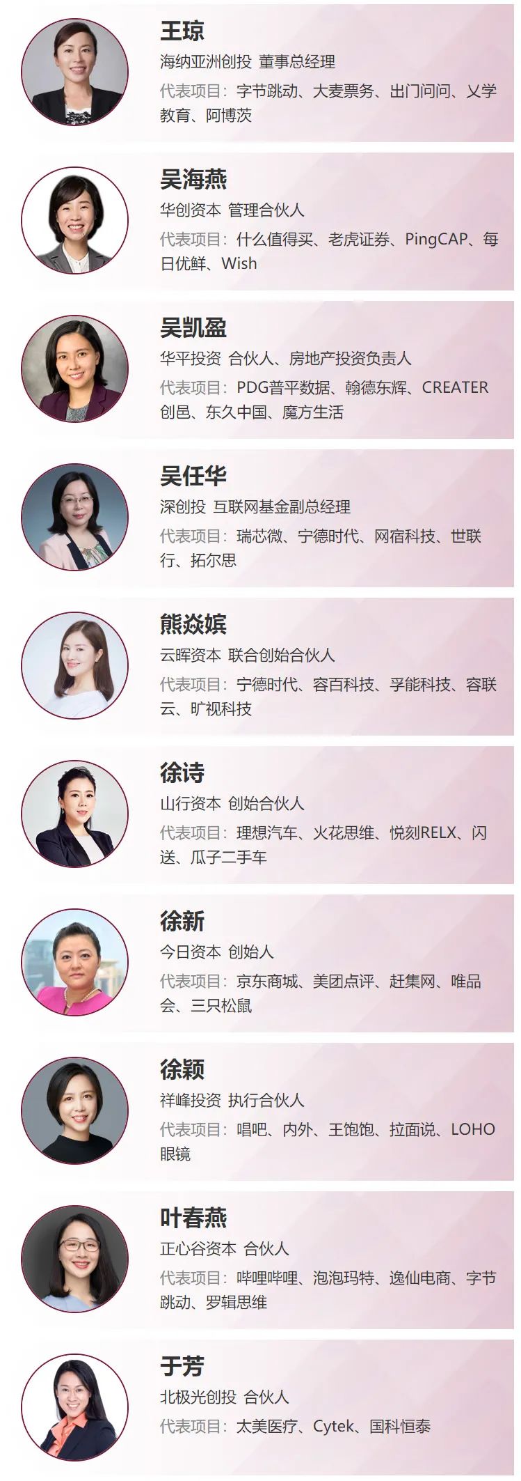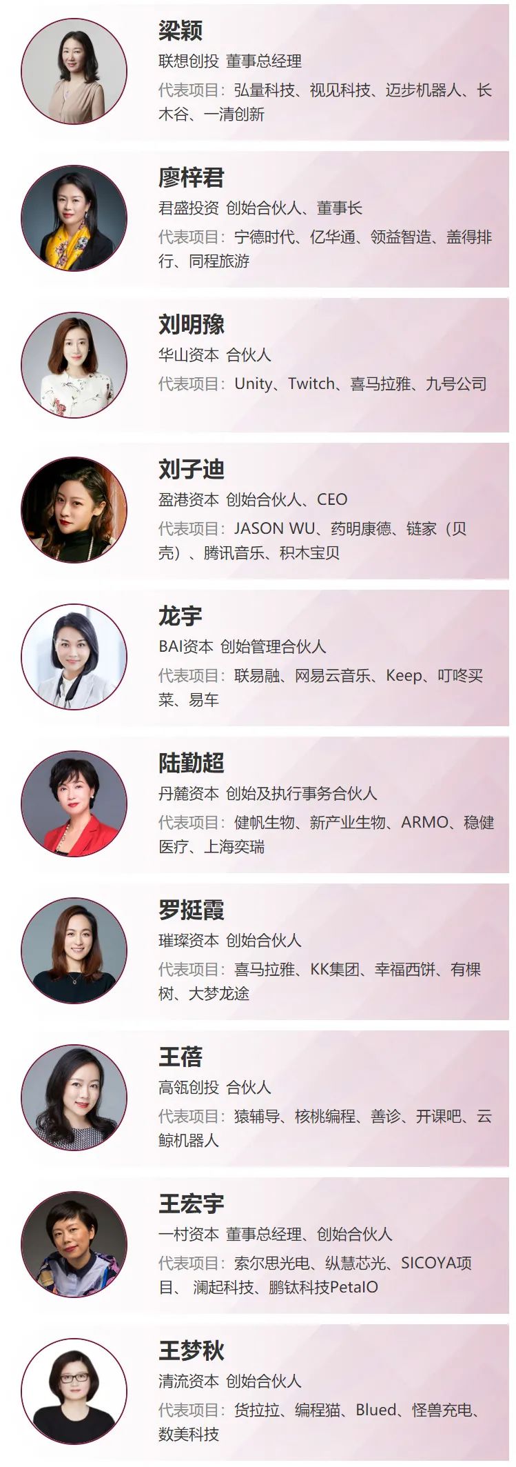 她们活跃在各行各业,关注的领域覆盖医疗健康、新消费、硬科技、TMT、大文娱......有创业者的地方,就有她们的身影。她们凭借着敏锐的眼光,投出了一系列令人惊喜的案例——字节跳动、美团、宁德时代、蔚来汽车、商汤科技、完美日记、泡泡玛特、百果园、甘李药业、药明康德.....每一个行业巨头背后,都有她们倾注的努力与心血。