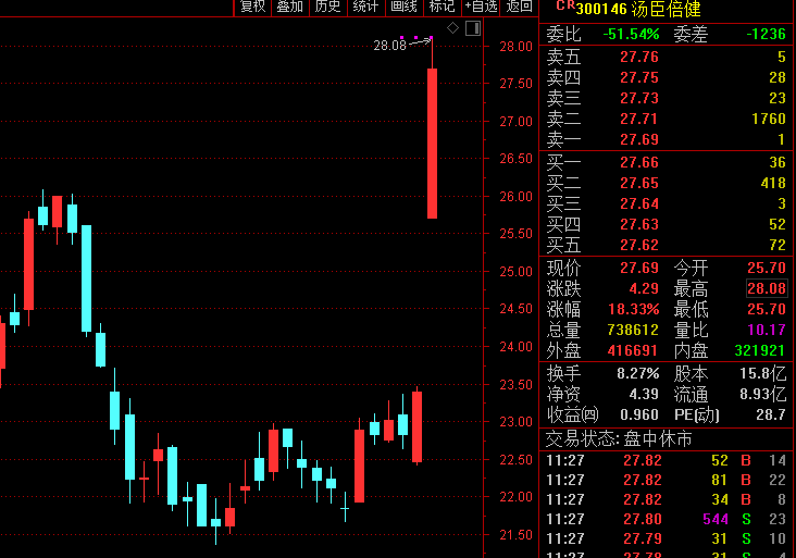 汤臣倍健高开高走,一度涨停,涨幅20%,报28.08元,股价创年内新高,市值超400亿元。
