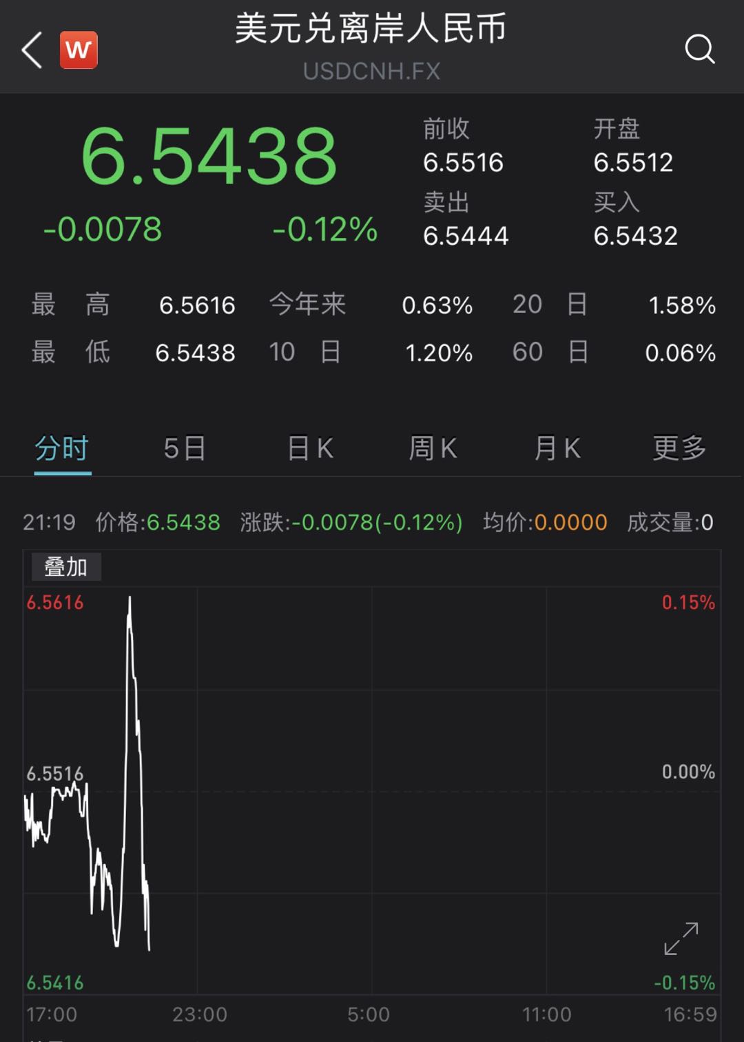 原标题:人民币对美元即期汇率盘中跌破6.54,一度抹去今年涨幅