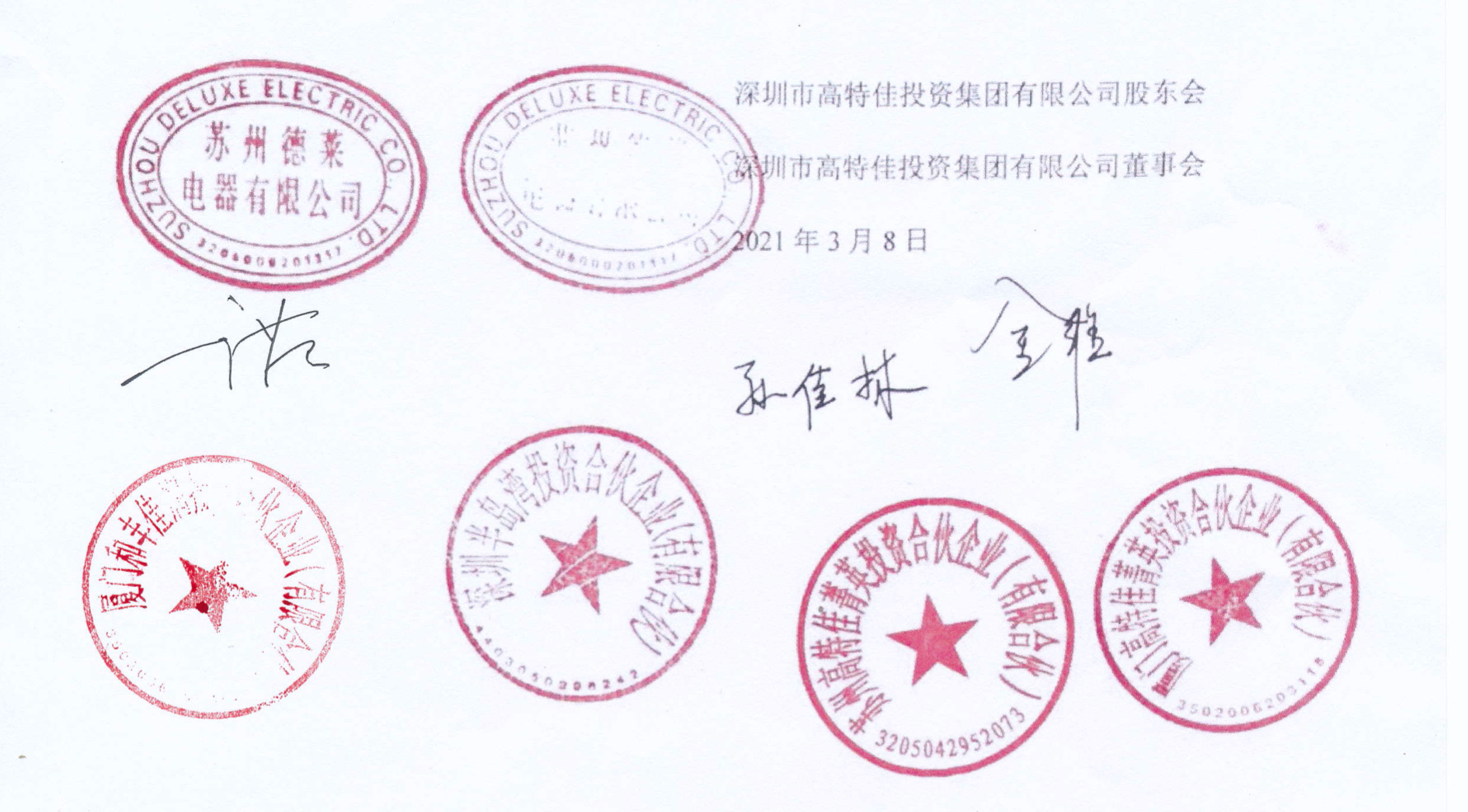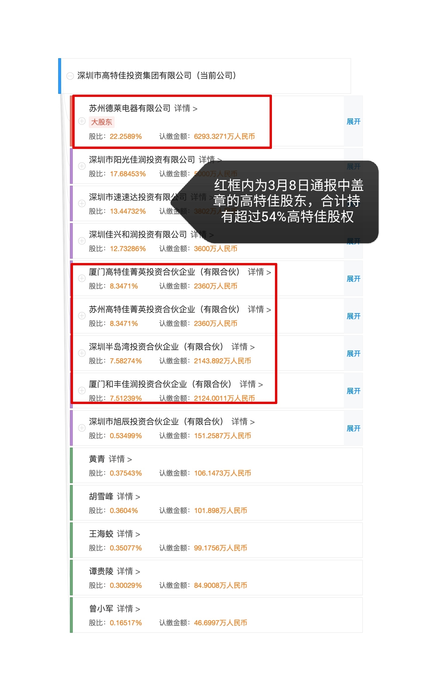 不同于前一日金惠丽没有加盖公章的声明及处分决定,该通报落款为高特佳股东会、董事会,高特佳二股东苏州德莱附公章,高特佳其他股东——厦门高特佳菁英投资合伙企业、苏州高特佳菁英合伙企业、深圳半岛投资合伙企业、厦门和丰佳润投资合伙企业等也均加盖公章,所有加盖股东共持有高特佳股权超过54%。卞庄、孙佳林、金维等三人在该通报上分别签字。孙佳林为高特佳执行合伙人,根据天眼查APP,卞庄为高特佳董事、德莱董事长兼总经理,金维为高特佳监事。