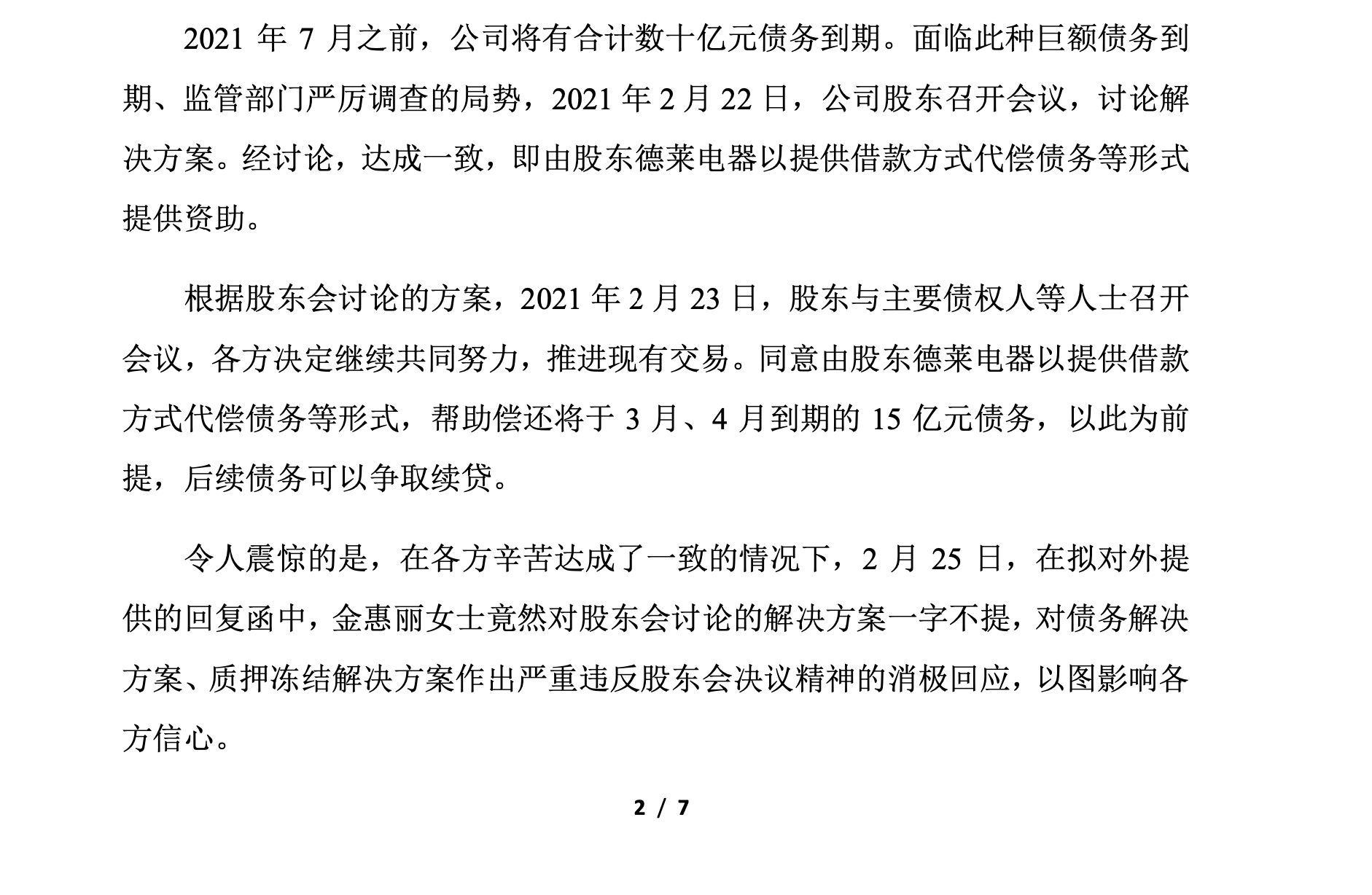 虽然在2月22日的高特佳股东会议中曾讨论该事项,但是上述股东发布的通报中表示,金惠丽在拟对外提供的回复函中,对股东会讨论的解决方案一字不提,消极回应。