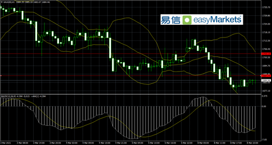 技术上黄金上方压力在1688美元附近,下方形态偏空,而支撑则是1676美元附近再破位则打开了下跌空间。指标看布林线布林线开口向下,似乎趋势偏弱,而MACD指标金叉似乎短线下跌加速有放缓。所以黄金后市形态震荡偏空为主,关注日内压力情况,逢高空,突破压力空头离场。
