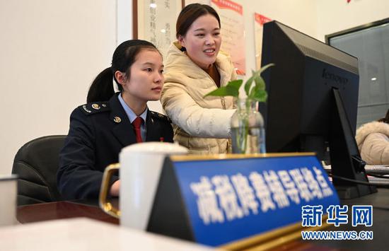2020年12月17日,福建省德化县冠鸿陶瓷有限公司陈兰花(右)在浔中镇阳光社区减税降费辅导联络点咨询企业社会保险费申报事宜。新华社记者林善传摄
