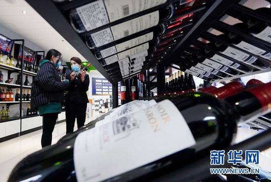 2月1日,顾客在中国(河北)自由贸易试验区曹妃甸片区的跨境保税商品展示中心选购进口葡萄酒。新华社发