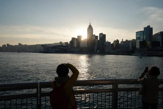 2021年1月1日,香港市民在维多利亚港岸边观看日出。李钢摄(新华社)