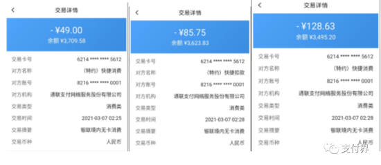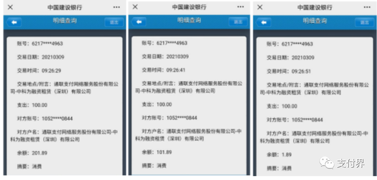 无独有偶,3月9日,另外一位用户查询自己的账户时发现,自己中国建设银行卡中的钱,在自己不知情的情况下,被通联支付网络服务股份有限公司-中科为融资租赁(深圳)有限公司连续三次扣走了100元钱,300元钱凭空消失。