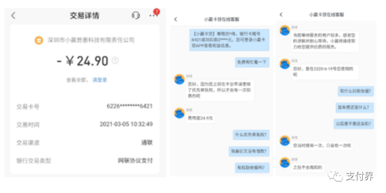 还有一位用户的经历显示,3月5日上午,该用户被深圳市小赢普惠科技有限公司使用通联扣款24.9元,咨询客服后发现,扣款原因为,该用户在2020年6月19日使用过小赢卡贷的贷款产品,“因为您之前在平台申请使用了优先审批权,所以会有一次扣费。”