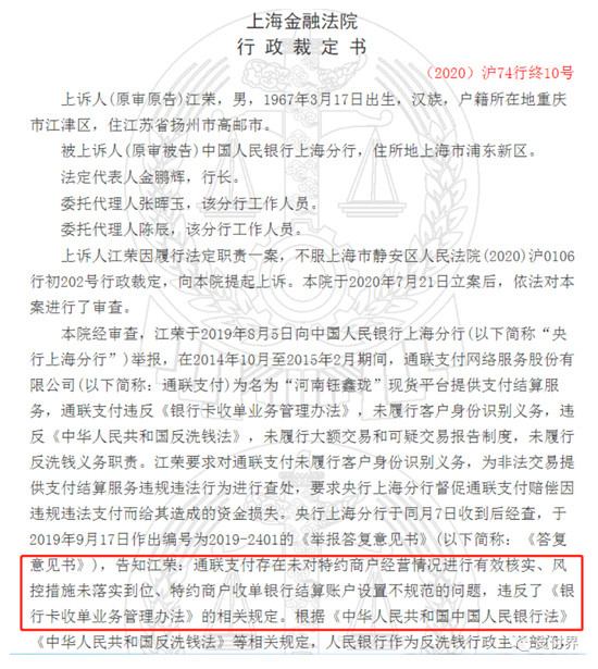 上海金融法院审查,江先生于2019年8月5日向中国人民银行上海分行举报,在2014年10月至2015年2月期间,通联支付为名为“河南钰鑫珑”现货平台提供支付结算服务,通联支付违反《银行卡收单业务管理办法》,未履行客户身份识别义务,违反《中华人民共和国反洗钱法》,未履行大额交易和可疑交易报告制度,未履行反洗钱义务职责。
