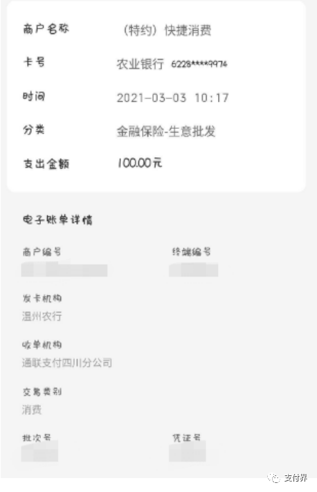 支付界从一位用户获悉,3月3日,通联支付四川分公司分4次从其中国农业银行卡中共刷走1650元,其中分类为金融保险-生意批发支出金额100元,分类为其他门类-其他分别为500元、1000元、50元。