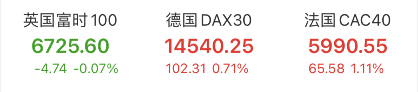 欧股方面,截止收盘,英国富时100跌0.07%,德国DAX30涨0.71%,法国CAC40涨1.11%。