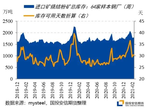 从目前终端钢厂的烧结矿库存来看,整体库存较充裕,可用天数仍在30天左右。近期国产铁精粉又相对进口精粉出现一定的价格优势,因此进口烧结矿的入炉配比又有所下滑。钢厂基本按需采购,并无进一步大幅补库进口矿的动力。
