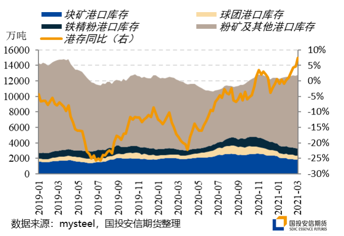 矿石主要的库存压力都集中于港口贸易环节。近期港口的粉矿库存持续累增,整体45港矿石库存已经从春节前的12519万吨累增至12789万吨,贸易矿占比也高至49.6%。其中,巴西高品粉矿的库存累增尤为显著,澳矿的压力相对较小一些。所以从铁矿石的库存结构来看,终端按需采购,贸易库存压力较集中,对粉矿价格、尤其高品矿市场形成较大压力。期货盘面主要对标的澳洲中品矿暂时还无明显压力,等待接近5月是否逐渐体现出发运增量。