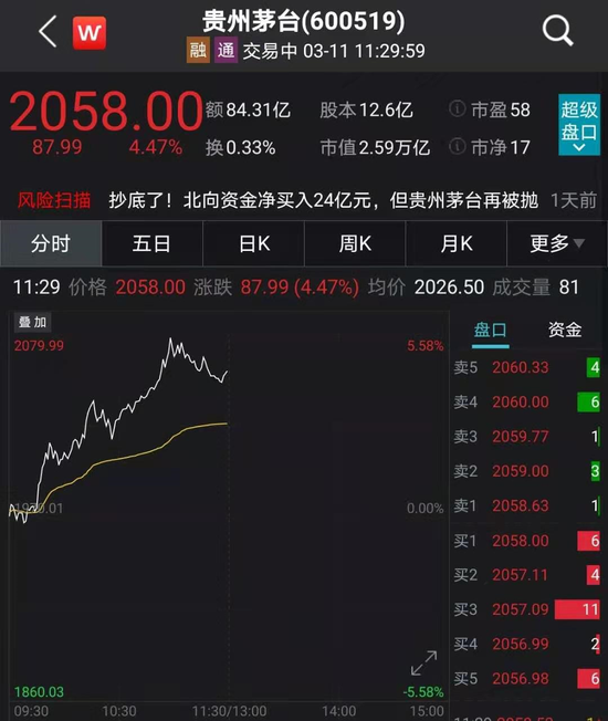 A股核心资产的“最核心”-贵州茅台早盘一度上涨超5%,重返2000元上方。截至午间收盘,贵州茅台上涨4.47%。