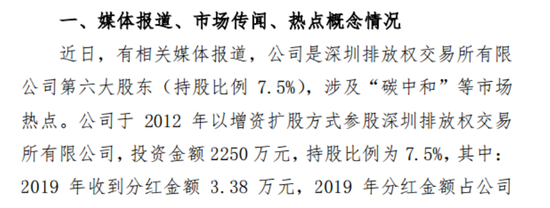 虽然华银电力在公告中表示,投资确有其事,但公司投资参股深圳排放权交易所,仅获得12.2万元分红,对公司业绩影响有限。