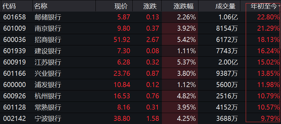 其中,邮储银行年内上涨22.8%,南京银行年内上涨21.29%,招商银行年内上涨18%。