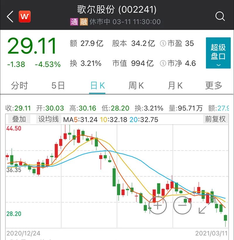 不过,歌尔股份的大举回购并没改变股价下行之势,3月10日歌尔股份报收于30.49元。截至3月11日上午收盘,该股继续下跌超过4%。