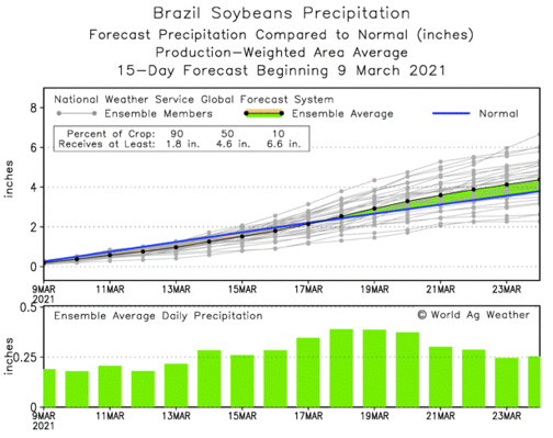 阿根廷的零星降水将有利于改善土壤墒情。布宜诺斯艾利斯谷物交易所发布的周报称,截至3月3日的一周,高温干燥天气开始影响到阿根廷中部和南部农业区的大豆作物生长。阿根廷大豆评级优良的比例仅为10%,比一周前减少5%。评级一般的大豆作物为70%,和一周前持平。
