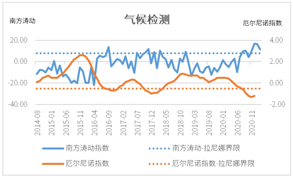 春播方面,目前的南方涛动指标和厄尔尼诺指数都显示,拉尼娜有缓和的迹象,未来预计将会在5月后逐步转为厄尔尼诺中性。3月31日美国农业部将发布种植意向报告,如果播种面积延续此前预计的趋势,美豆或有产量大幅提升的机会。