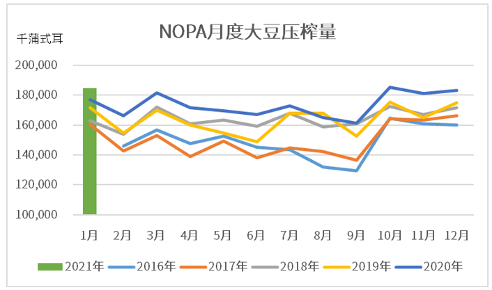 全美油籽加工商协会(NOPA)2月16日发布的数据显示, 1月大豆压榨量为1.84654亿蒲式耳。且美国农业部发布的油籽加工月报显示, 2021年1月份大豆压榨量为5,895,360吨(相当于1.97亿蒲式耳),比2020年12月份增加101,127吨,同比增加231,597吨。目前美豆压榨利润仍然丰厚,后续预计压榨量将持续较好。
