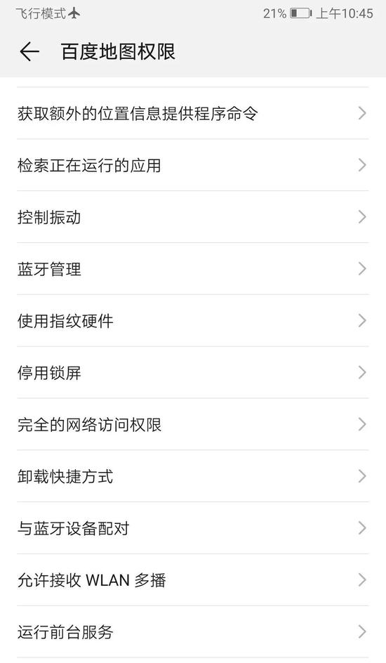 用华为手机从自带的应用市场下载百度地图APP,进入手机设置中的权限管理界面可以看到,百度地图涉及的权限除了通讯录,还包括储存、电话、位置信息、相机等在内的10项权限。