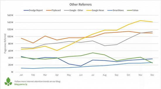彼时,搜索巨头谷歌在网站导流上进入瓶颈期,增长乏力,而Facebook则呈现出向上的态势。根据Parse.ly 的追踪,到2016年,平均40%的外部引用来自Facebook,35%来自谷歌搜索。