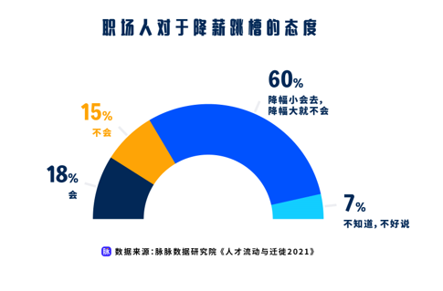 尽管职场人看重薪资待遇,但整体呈现出稳中求“金”心态。对于降薪跳槽,今年有78%的职场人呈现“可接受”的态度,高于去年的64%比例,其中有60%的受访者表示 “降幅小会去,降幅大就不会去。”