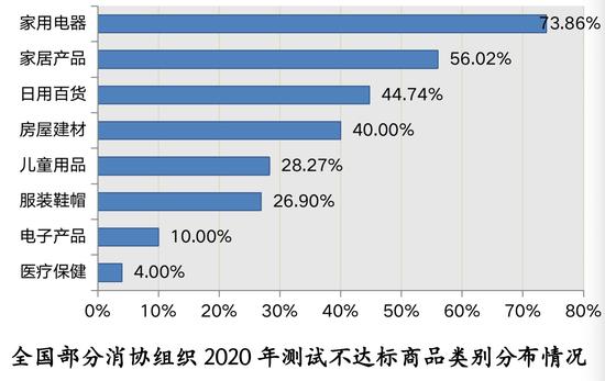 据北京阳光消费大数据研究院统计,全国部分消协2020年测试的1191件采样商品,主要涉及服装鞋帽、儿童用品、日用百货、家居产品、家用电器、医疗保健、电子产品和房屋建材等8种商品类型。其中,家用电器类样品不达标率最高,不达标率为73.86%,问题主要集中在产品性能不佳、耗电量大、标识不规范以及设计结构存在安全隐患等方面;其次是家居产品、日用百货和房屋建材类样品,不达标率分别为56.02% 、44.74%和40.00%;此外,儿童用品类样品不达标率为28.27%,服装鞋帽类样品不达标率为26.90%,电子产品类样品不达标率为10.00%,医疗保健类样品不达标率为4.00%。