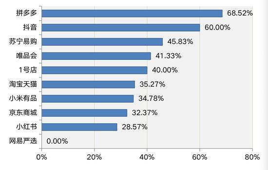 统计数据显示,在832件消协测试的线上采样商品中,拼多多采样不达标率最高,54件采样商品有37件不达标,不达标率高达68.52%;其次是抖音平台,采样商品不达标率也达到了六成;此外,苏宁易购、唯品会和1号店3个平台均有四成或四成以上样品不达标,淘宝天猫、小米有品和京东商城均有三成以上样品不达标,网易严选和小红书的采样商品达标情况相对较好。