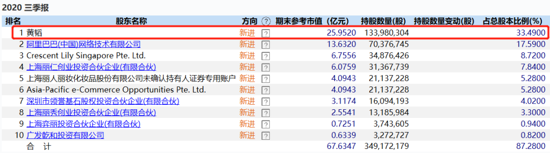 而截至2020三季度末,黄韬持有上市公司33.49%的股份,系第一大股东,以最新收盘价计算,其身价已超过40亿元。阿里巴巴位居第二大股东,持股比例为17.59%,由此可见丽人丽妆属于阿里系上市公司。