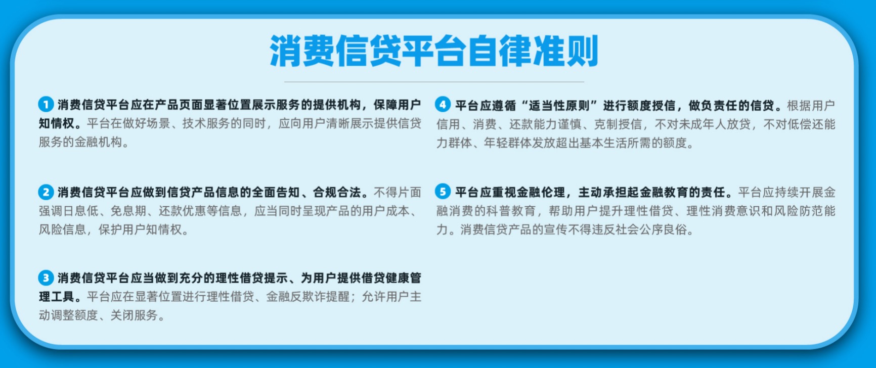 在消费金融领域,蚂蚁集团提出这些准则包括:不得片面强调日息低、免息期、还款优惠等信息,应当同时呈现产品的用户成本、风险信息;平台应遵循“适当性原则”进行额度授信,做负责任的借贷;消费信贷平台应在产品页面显著位置展示服务的提供机构,并对信贷产品信息的全面告知;根据用户信用消费、还款能力等谨慎、克制授信,不对未成年人放贷,不对低偿付能力群体、年轻群体发放超出基本生活所需的额度。
