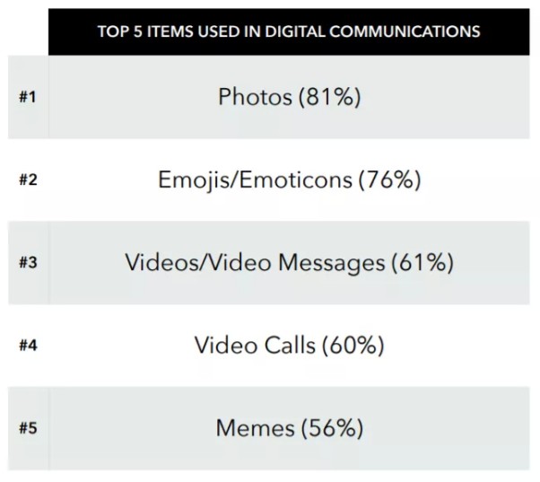 在交流中,年轻用户更愿意利用视觉媒介,以便更加准确和便利地表达语境和细节。视频较文字而言能够更好地表达出某种动作、反应和回应,表情(emoji)也能用更少的字符表达更多的含义。如果品牌想要和Snapchatter走得更近,就需要注意到这一关键点。