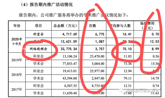 IPO说明书显示,2020年1月到9月,学术推广开了23470个科室会议,平均每天87个、5004个学术会议,平均每天18.5个,3757个网络视频会议,平均每天13.9个。