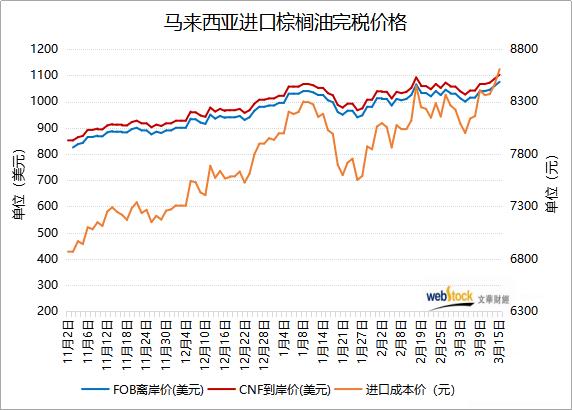 3月15日马来西亚棕榈油离岸价为1075美元,较上日涨15美元,进口到岸价为1102美元,较上日涨15美元,进口成本价为8608.4元,较上日涨142.94元,为连续第三日上涨。受库存偏紧及豆油升势提振,马来西亚BMD毛棕榈油期货周五连续第八个交易日上涨,盘中触及13年新高,周线创下近五年半最大单周升幅,棕榈油进口成本跟盘大涨。