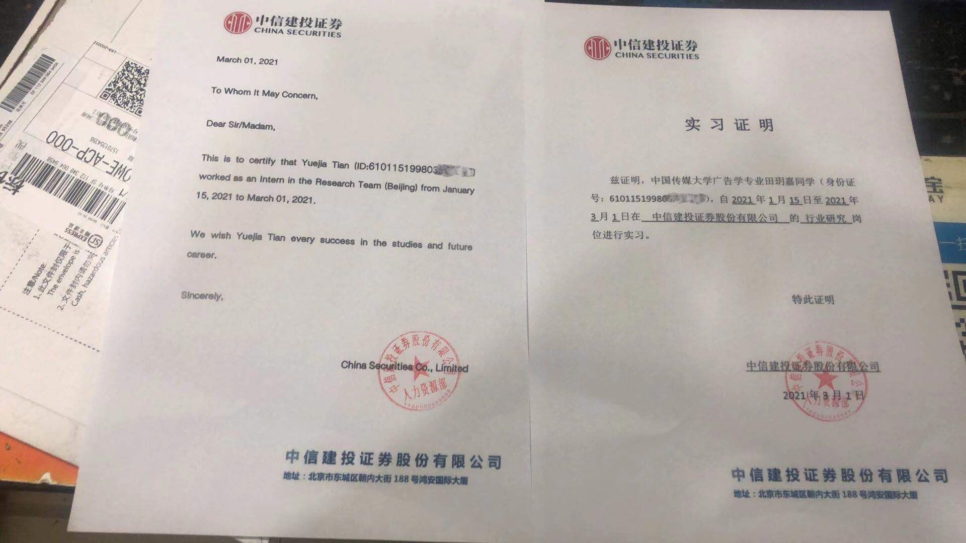 记者给对方提供了假的姓名、身份证号码、随意编写的学校、专业,3 月12 日,记者收到了尚职路提供的中英文实习证明,上面注明某某同学曾于2021 年1月15 日至2021 年3 月1 日在中信建投证券股份有限公司的行业研究岗位实习。