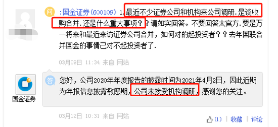 上证e互动显示,投资者在国金证券页面提出“最近不少证券公司和机构来公司调研,是谈收购合并,还是什么重大事项?”。