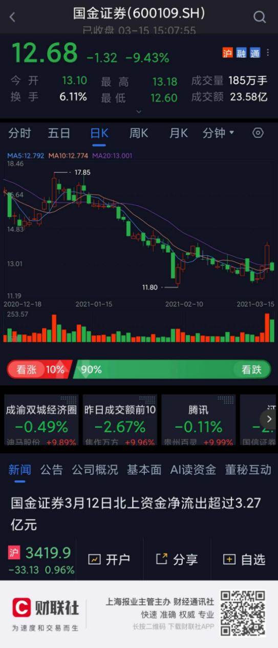 3月15日,国金证券开盘跳空低开跌6.43%,尾盘一度跌停,股价全天在跌停板附近徘徊。截至收盘,国金证券跌幅为9.43%,成交23.58亿元,与上周五成交额32.47亿元有一定差距,国联证券收盘跌幅高达5.95%。