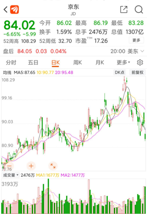 并购传闻的另一主角京东上周五在美股市场大跌,截至当日收盘,京东下跌6.65%。京东大跌,也与当日热门中概股多数走低有关,腾讯ADR跌超7%,阿里巴巴跌超3%,蔚来、理想汽车跌超1%。