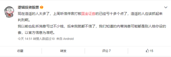 “上周听信传言打板国金证券的已经亏十多个点了,还是熟悉的配方,熟悉的味道,一个造谣一个辟谣,就完美收割了一波韭菜。”有投资者无奈吐槽。