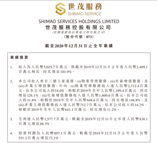 热点栏目3月15日消息,世茂服务发布全年业绩,公司2020年收入为50.26亿元,同比增长101.9%。其中,物业管理服务收入达27.12亿元,占本公司收入的54.0%,相较于2019年全年人民币11.99亿元,同比增长126.1%;小区增值服务收入达人民币16元,占本公司收入的31.8%,相较于2019年全年人民币6.49亿元,同比增长146.8%;iii)非业主增值服务收入达人民币7.13亿元,占公司收入比14.2%, 相较于2019年全年人民币6.41亿元,同比增长11.2%。