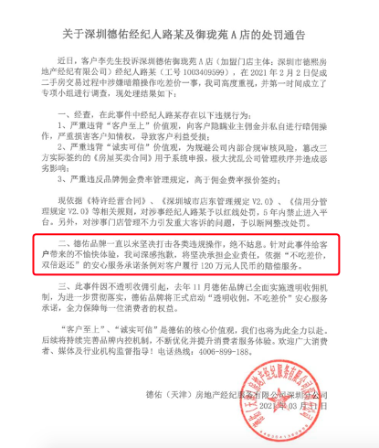 3月14日,德佑(天津)房地产经纪服务有限公司深圳分公司进行回应,称经纪人私自进行暗佣操作,违反佣金费率管理规定,高于佣金费率报价签约,对客户履行120万元的赔偿。