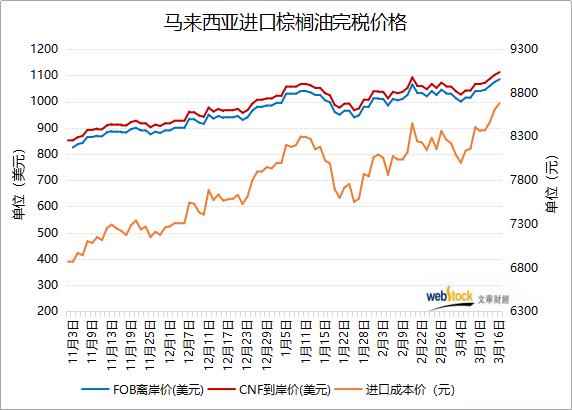 3月16日马来西亚棕榈油离岸价为1085美元,较上日涨10美元,进口到岸价为1112美元,较上日涨10美元,进口成本价为8681.38元,较上日涨72.98元。因出口下滑放缓,且原油和其他食用油价格在全球供应趋紧的背景下攀升,马来西亚BMD毛棕榈油期货周一连续第9个交易日上涨,创近19年来最长的连涨周期,棕榈油进口成本继续跟盘上涨。