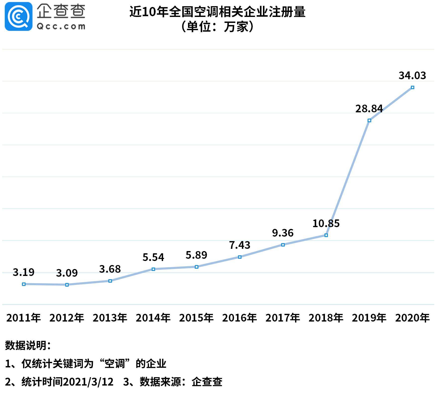 近10年我国空调相关企业年注册量呈逐年递增趋势。企查查数据显示,2011-2018年年均注册量位6.1万家。2019年相关企业注册量猛增,全年新注册企业达28.84万家,同比上升了166%。2020年持续攀升,注册量达34.03万家,同比增长18%。