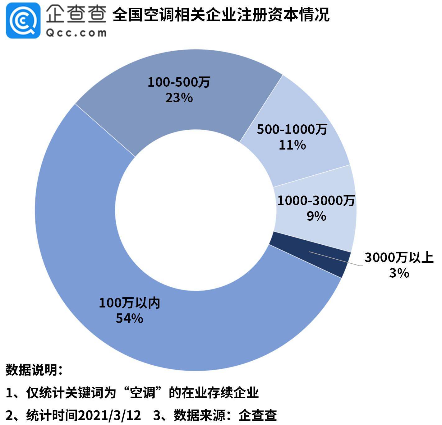 从注册资本来看,企查查数据显示,近8成的空调企业注册资本在500万以内,其中54%的企业注册资本在100万以内,23%的企业注册资本在100-500万这个区间,而注册资本在3000万以上的则占总量的3%。