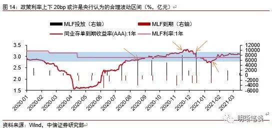 其三,同业存单利率当前处于央行调控区间上限附近,若同业存单利率突破则可能触发央行超额续作。2020年8月央行首次超额续作MLF,当时1年期同业存单利率正快速接近1年期MLF操作利率,而2020年11月央行新作MLF时1年期同业存单利率达到3.25%以上,2020年12月央行继续大额续作MLF时1年期同业存单利率接近3.15%,而2021年1月小幅超额续作MLF并开始逐步收紧流动时1年期同业存单利率接近2.75%。春节后央行始终维持等额对冲操作,1年期同业存单利率维持在3.15%附近。因而如果大致将1年期MLF操作利率上下20bp假设作为央行认可的市场利率波动幅度,那么在4月份的流动性缺口较大、同业存单到期规模较大的背景下,同业存单利率面临着上行的压力,而一旦上升突破央行任何的合理范围,料央行大概率会通过加大MLF净投放量来完成市场利率的引导。