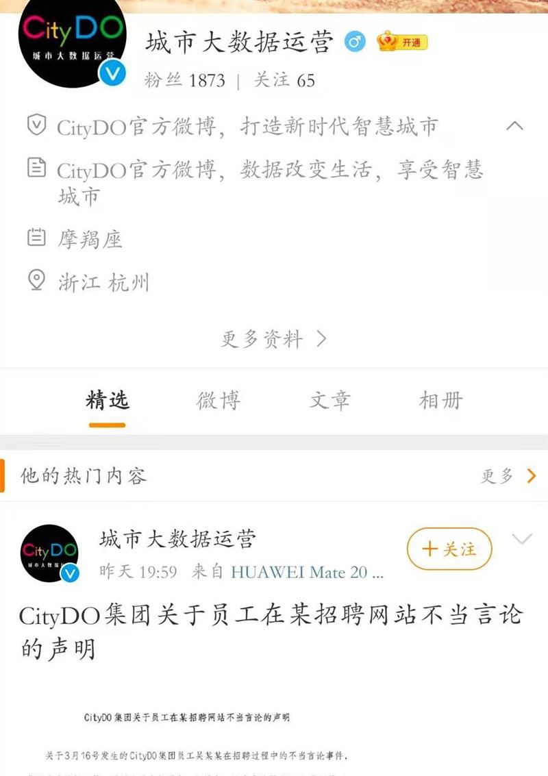 涉事企业微博 截图来源:微博CityDO集团表示:“此事系员工个人不当言论,不代表任何CityDO官方态度,CityDO官方对该言论表示反对。针对此次事件引起的不良影响及为应聘者带来的困扰,向公众表示真诚歉意。公司已按相关制度对该员工做出严肃批评教育及处理。”
