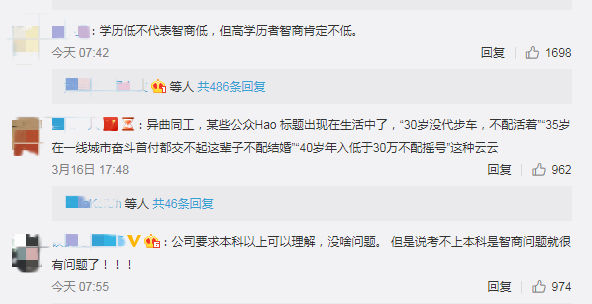 中国网财经3月17日讯 今日,一则“招聘称考不上本科是智商有问题”的话题冲上了热搜。据相关报道,在线上招聘平台上,一求职者想投递杭州某大数据公司的产品运营岗位时,公司HR询问其大学学历,并表示他们只招收二本以上的统招,还称:“考不上本科的都是智商有问题”。